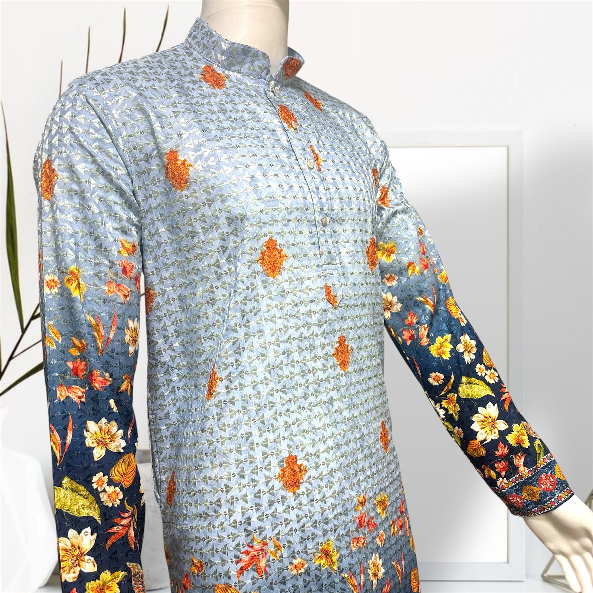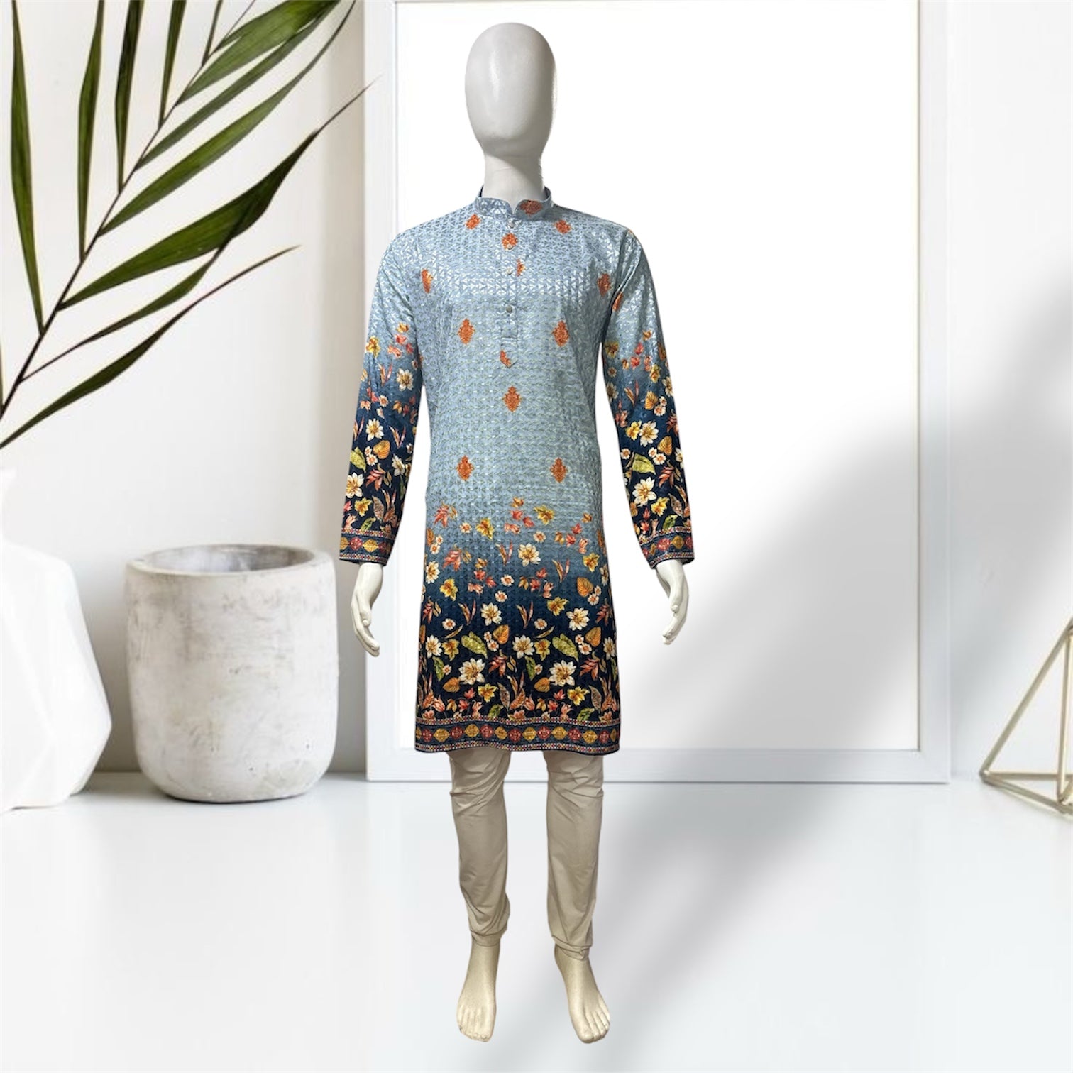 Cotton blend fabric with digital print with thread and sequins work all over the kurta. This kurta has mandarin collar, long sleeves, button closure, straight hem and side slit. This kurta has pockets on both sides.