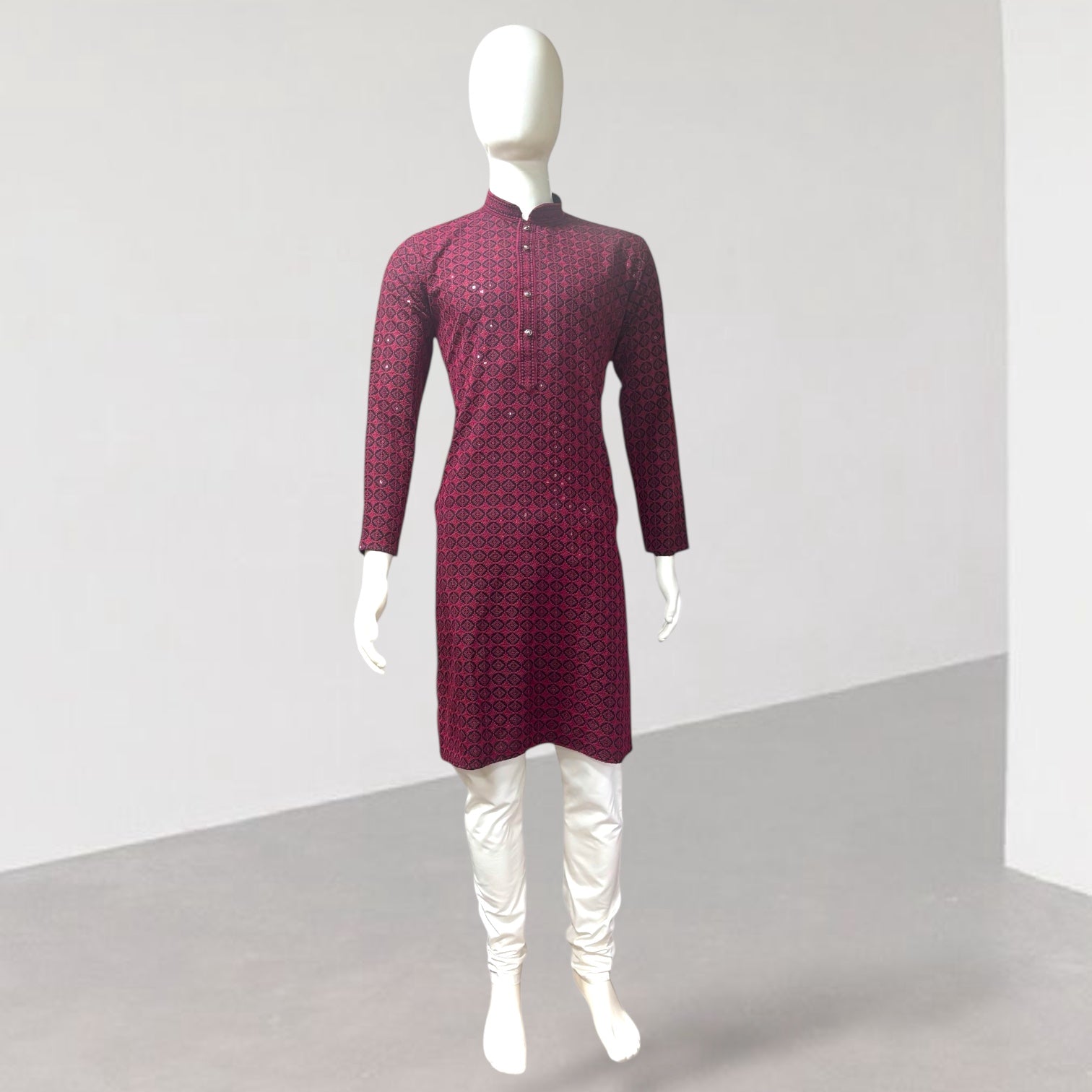 Rayon fabric with thread and sequins work all over the kurta. This kurta has mandarin collar, long sleeves, button closure, straight hem and side sleeves. This kurta has pockets on both sides.