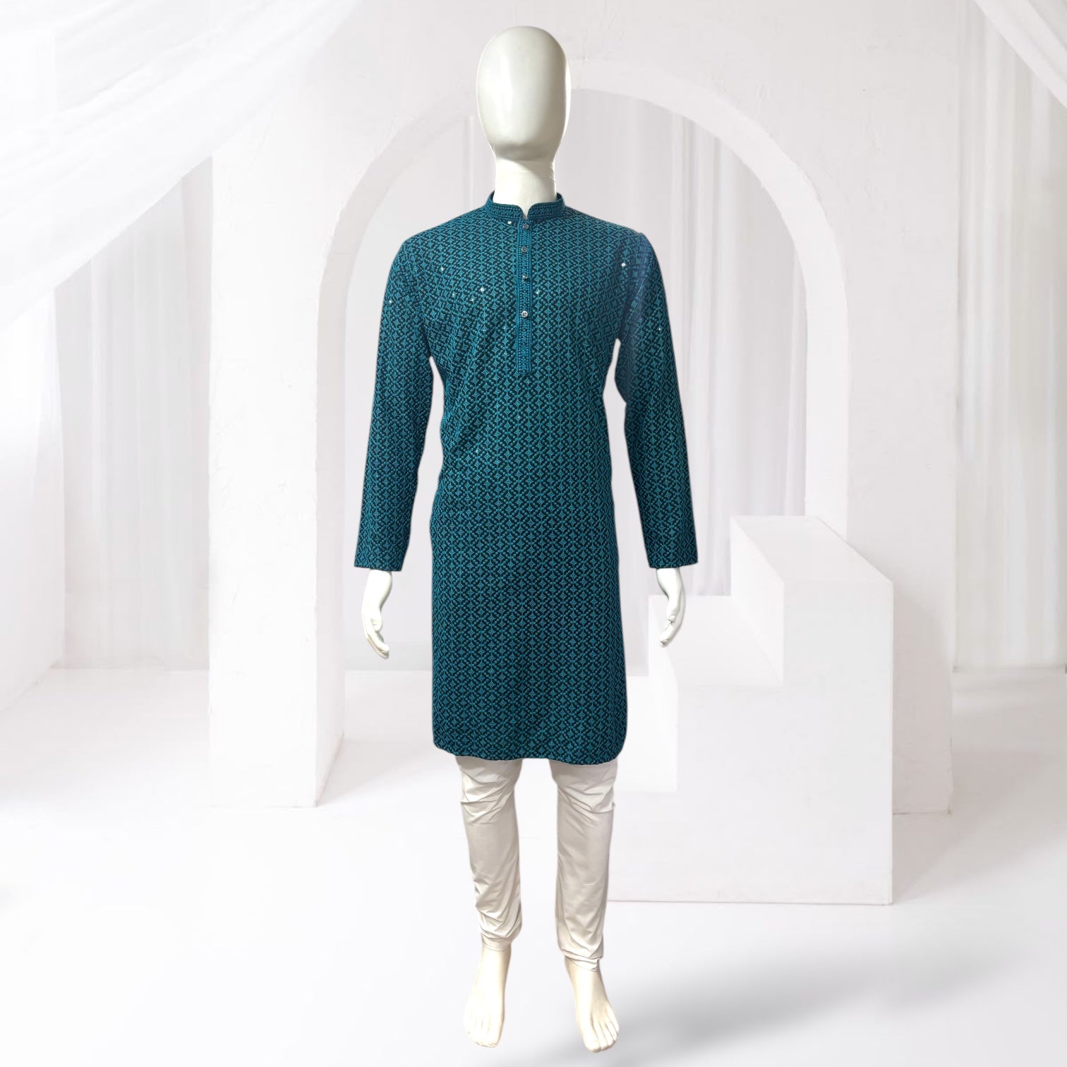 Rayon fabric with thread and sequins work all over the kurta. This kurta has mandarin collar, long sleeves, button closure, straight hem and side slit. This kurta has pockets on both sides.