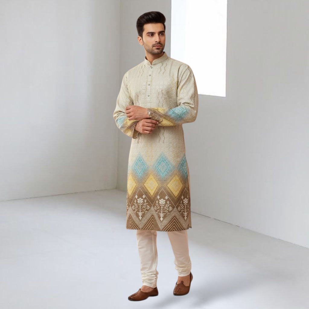 Cotton blend fabric with digital print in border and thread work all over the kurta. This kurta has mandarin collar, long sleeves, button closure, straight hem and side slit. This kurta has pockets on both sides.
