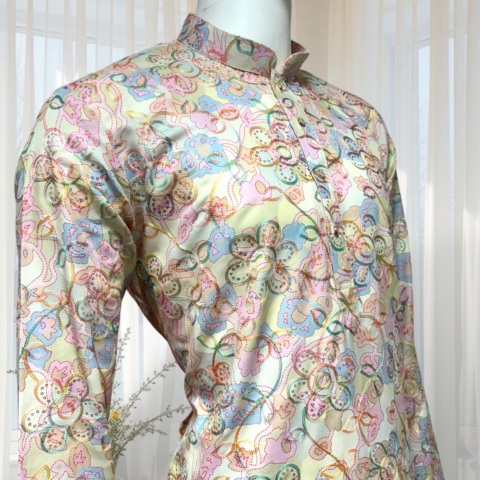 Digital printed kurta with thread and sequins embroidery. This kurta has mandarin collar, long sleeves, button closure, straight hem and side slit. This kurta has pockets on both sides.
